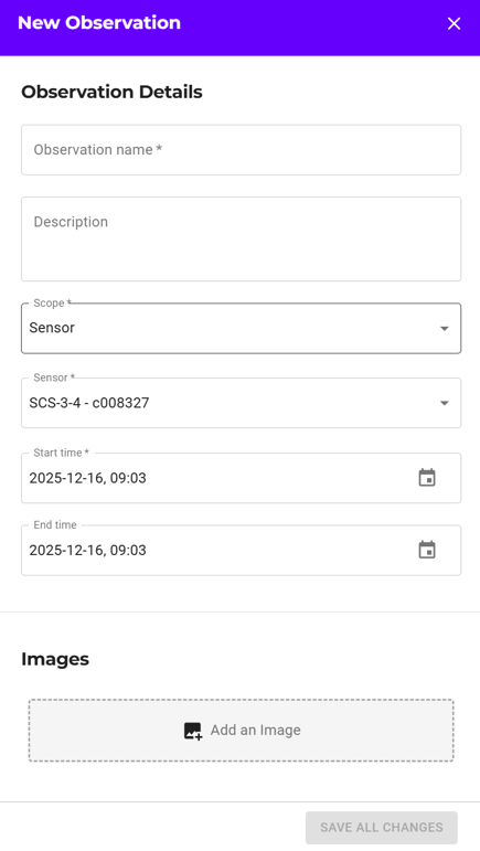 A drawer appears on the right side of the page. - Follow the prompts, and your new observation will save when you close the drawer. All fields marked with a * are mandatory. Click SAVE ALL CHANGES to save.