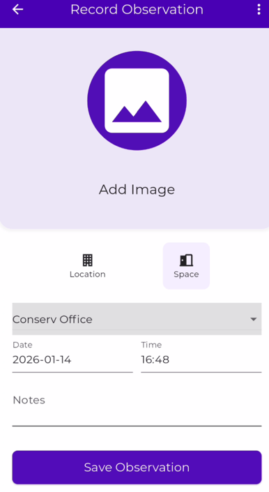 - Fill in the fields to enter observation details. Add an image if desired.