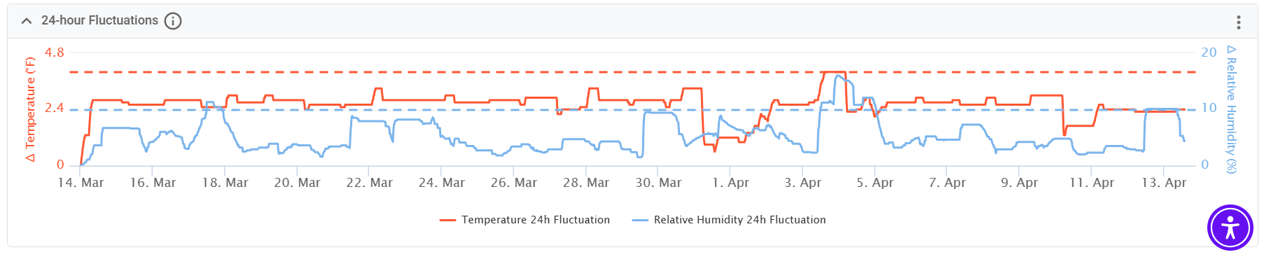24-hour fluctuations are calculated as the maximum difference between the maximum and minimum readings in the past 24 hours for each available reading. A dotted line will indicate the maximum allowance set by the user in the Level assigned to the sensor being shown. To learn more about Levels, see Understand Levels.