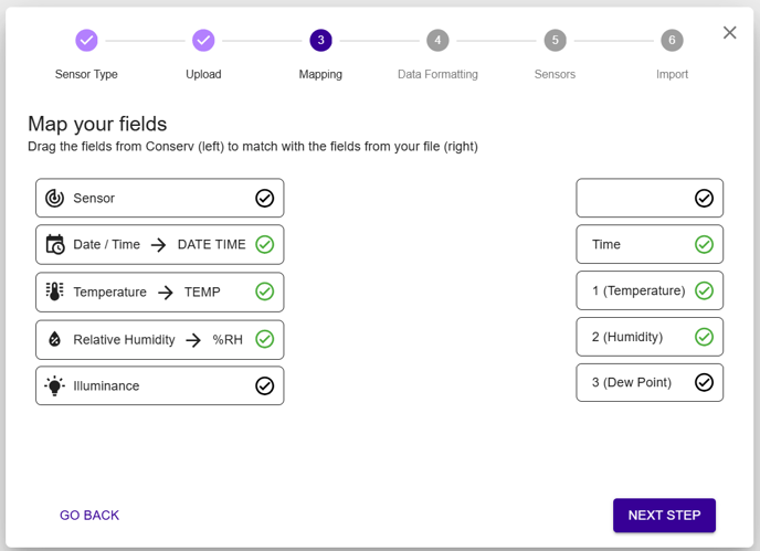 - Other logger brands require you to drag and drop the fields on the left to match the fields on the right. Tiny Tag files do not require this, and the import may fail if you make any changes here. Simply confirm you see the check marks as they should appear.