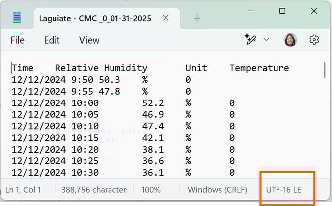 Conserv Cloud requires .csv files with standard UTF-8 encoding. If you try to upload a csv file with the wrong type encoding, it can fail. See, for example, this file from an Other Logger brand that has been saved in UTF-16 LE encoding.