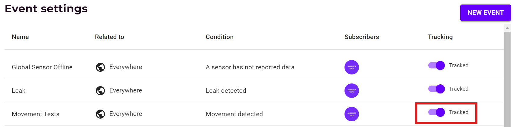 Confirm the event is being Tracked. The slider should be purple and have the purple ball to the right. If an event is Not tracked, that means it has been turned off, and no alerts will be sent if the conditions are met.