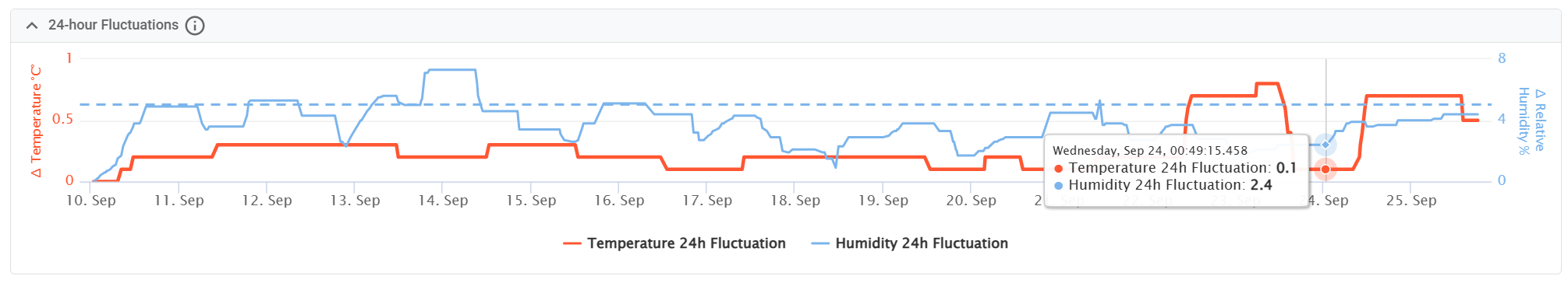 It's common for loan requirements and for preservation goals to have a daily fluctuation threshold as these big changes in temperature and humidity in a shorter timespan can have consequences to objects that are sensitive to swings in the environment. Conserv has made it easy to define a fluctuation threshold and then visualize a space's performance against that definition.
